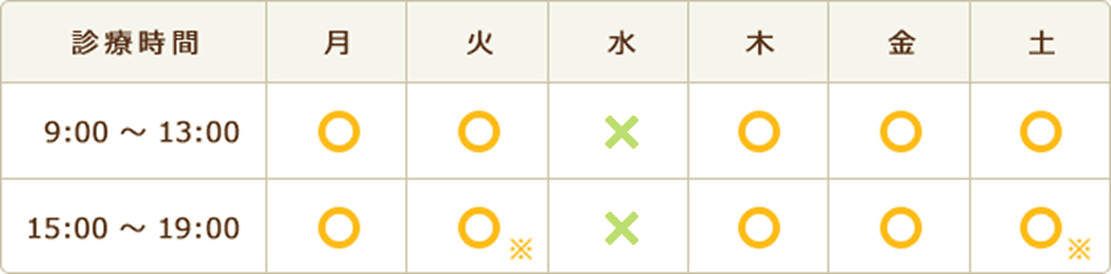 ※2025年12月16日より火・土曜の午後の診療が隔週でお休みとなります。(火曜午後が休診の週は土曜は通常診療、土曜午後が休診の週は火曜は通常診療となります。)