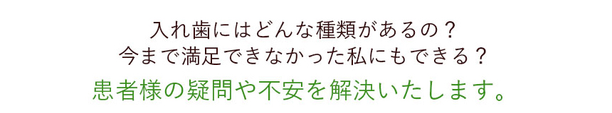 「薄く、違和感の少ない入れ歯」、「動かない・外れない入れ歯」「柔らかい材料を使い、痛くない入れ歯」「金属のバネを使わない、見た目のよい入れ歯」など、当院では豊富な種類の入れ歯を取り扱っております。患者さまそれぞれ、入れ歯・義歯に対するお悩みは異なります。そのお悩みやご要望に合わせて、「あなたにピッタリの入れ歯」をご提供いたしますので、入れ歯・義歯に関するご要望をお聞かせください。